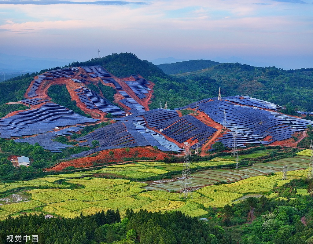 4月23日,江西吉安,永新縣蓮洲鄉的一座石漠化荒山建起一排排光伏發電板 圖片來源:視覺中國