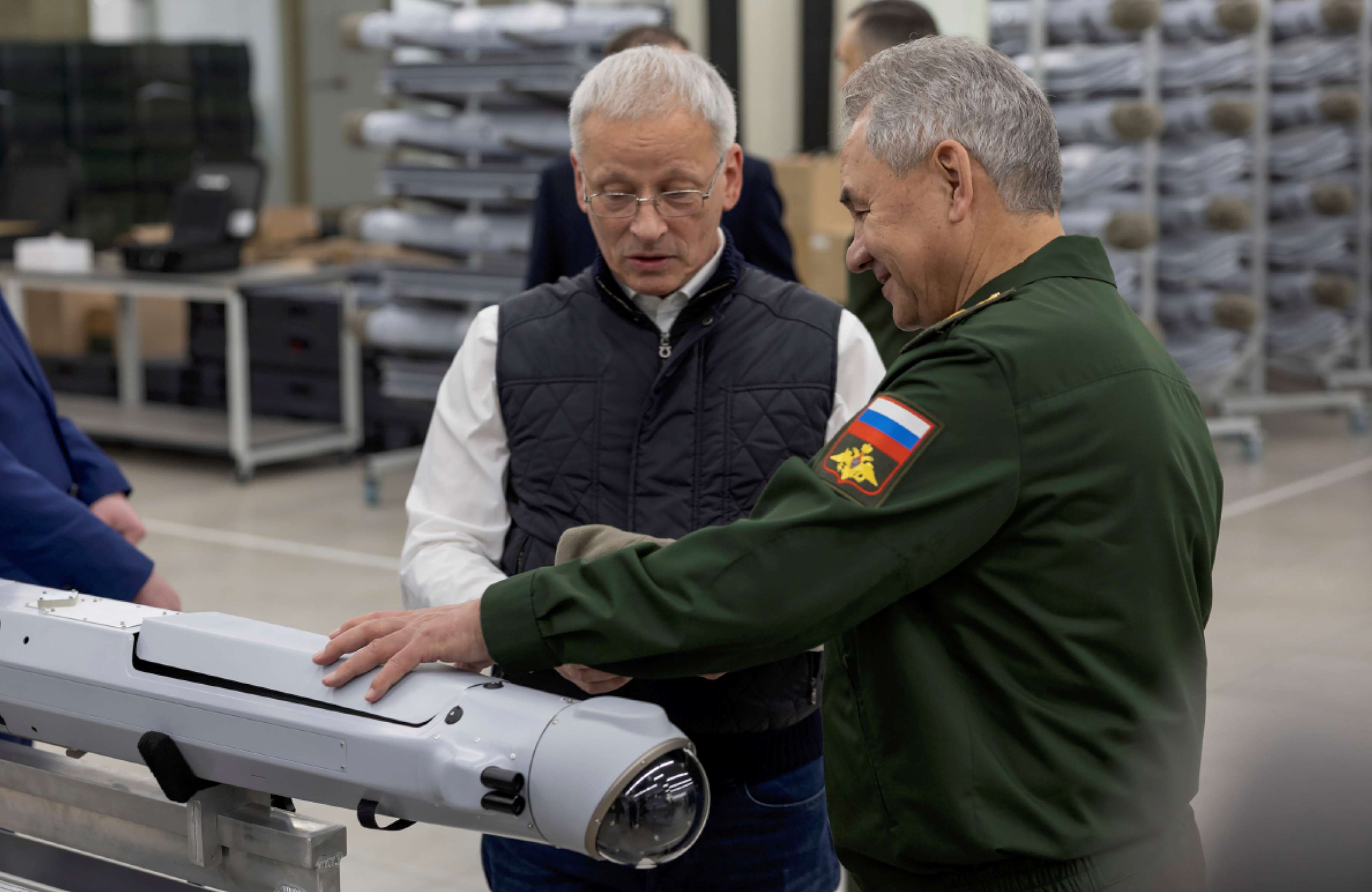 2024年2月10日,俄羅斯國防部部長紹伊古視察位於俄聯邦烏德穆爾特共和國的無人機生產企業。圖自澎湃影像