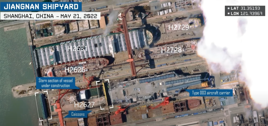 美國戰略與國際問題研究中心(CSIS)在2022年5月21號對上海江南造船長興船廠拍攝的衞星照片。右下角標註為Type 003aircraft carrier,就是“003福建號”航母在船台上的情景,右上角H2631是給中國台灣長榮造的集裝箱船。這兩條船跟另外四條編號為H2626、H2627、H2728、H2729的船放在一個船台上一起造,這樣一來船台成本就可以分攤得很低。俄羅斯的“庫茲涅佐夫號”航母因為沒有合適的船台,一直無法維修。