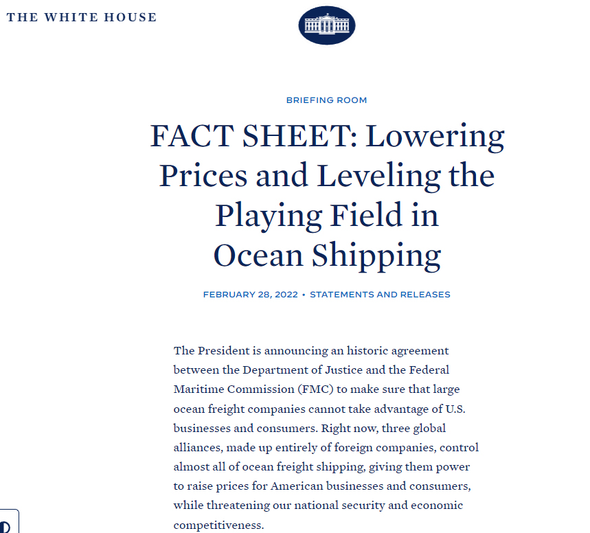 指責中國控制運費和運力分配,看看美國自己:2022年2月28日,美國司法部與聯邦海事委員會(FMC)達成一項名為《降低海運價格和平衡海運市場的事實陳述》的協議,要求對班輪公司採取行動降低海運價格、提高在美國的運力。這條新聞至今還掛在白宮的網站上。現在美國更是通過《海運改革法案》,對疫情期間已經完成交易的運價進行干預,掀起一輪託運人對班輪公司的訴訟狂潮。