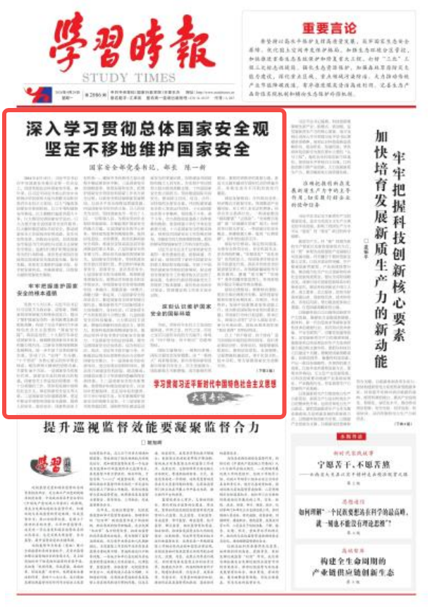 4月29日,《學習時報》頭版刊發國家安全部黨委書記、部長陳一新的署名文章《深入學習貫徹總體國家安全觀 堅定不移地維護國家安全》。全文如下: