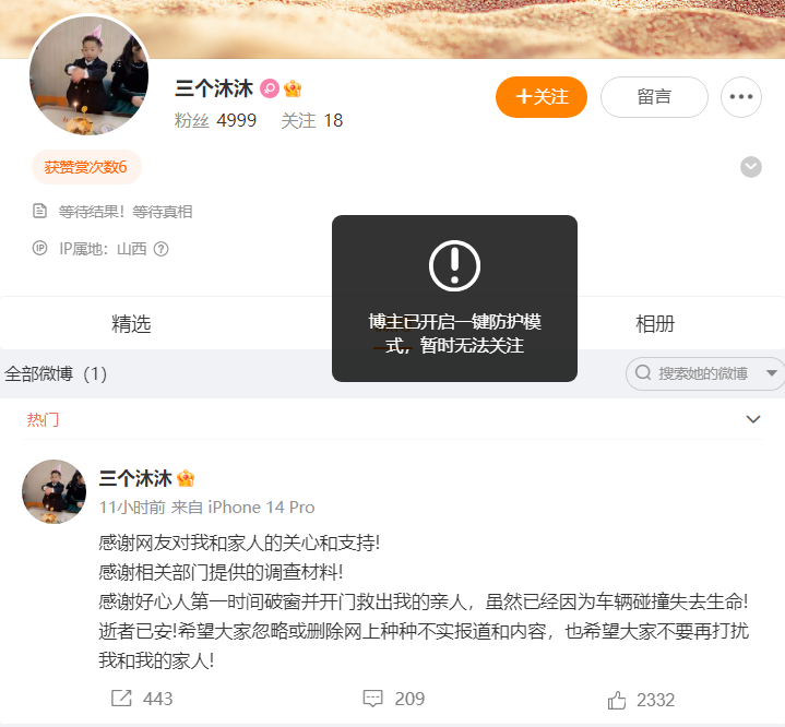 4月29日晚,逝者家屬在其個人微博賬號@三個沐沐 發佈最新聲明稱,“感謝網友對我和家人的關心和支持!感謝相關部門提供的調查材料!感謝好心人第一時間破窗並開門救出我的親人,雖然已經因為車輛碰撞失去生命!”