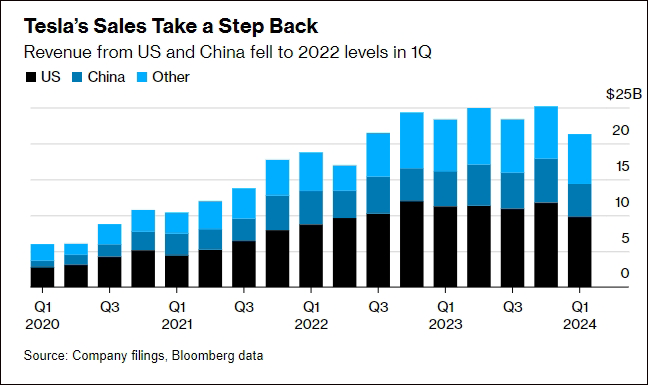 馬斯克訪華前,特斯拉麪臨市場需求疲軟和競爭加劇等問題。彭博社製圖