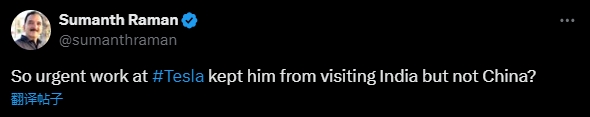 馬斯克的北京之行,同樣讓印度網民“咬碎了後槽牙”。其中,一名印度知名人士、電視主播蘇曼斯·拉曼感到非常“憤怒”,在社交媒體X平台發文質疑,“為什麼特斯拉的緊急工作讓馬斯克無法訪問印度,但並沒有阻止他前往中國”?
