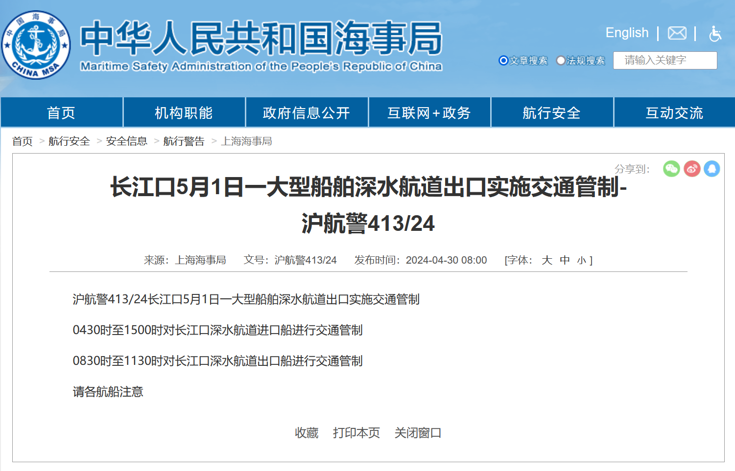 滬航警413/24長江口5月1日一大型船舶深水航道出口實施交通管制