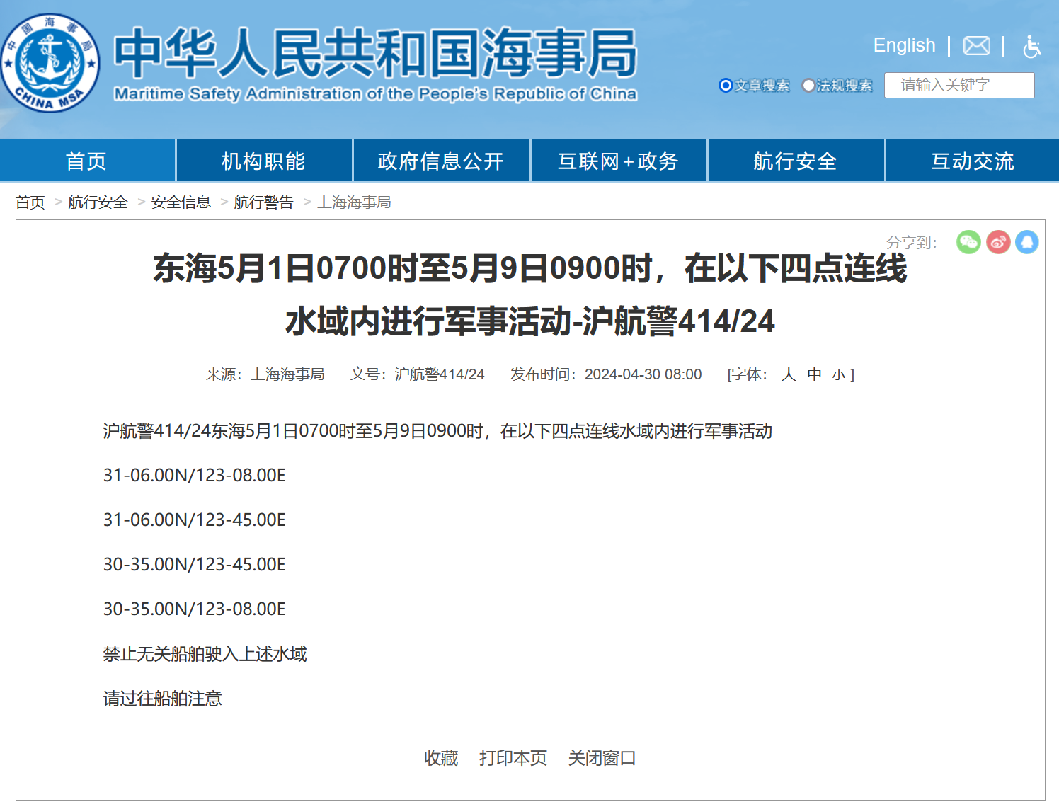 據中國海事局網站消息,上海海事局4月30日發佈兩條航行警告。
