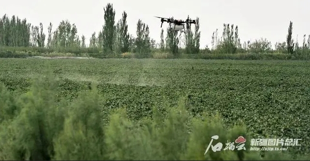 2023年9月19日,尉犁縣“極飛科技”智慧農業示範基地的3000畝“超級棉田”,無人機在給棉田噴灑防蟲藥。天山網-新疆日報記者 約提克爾·尼加提 攝