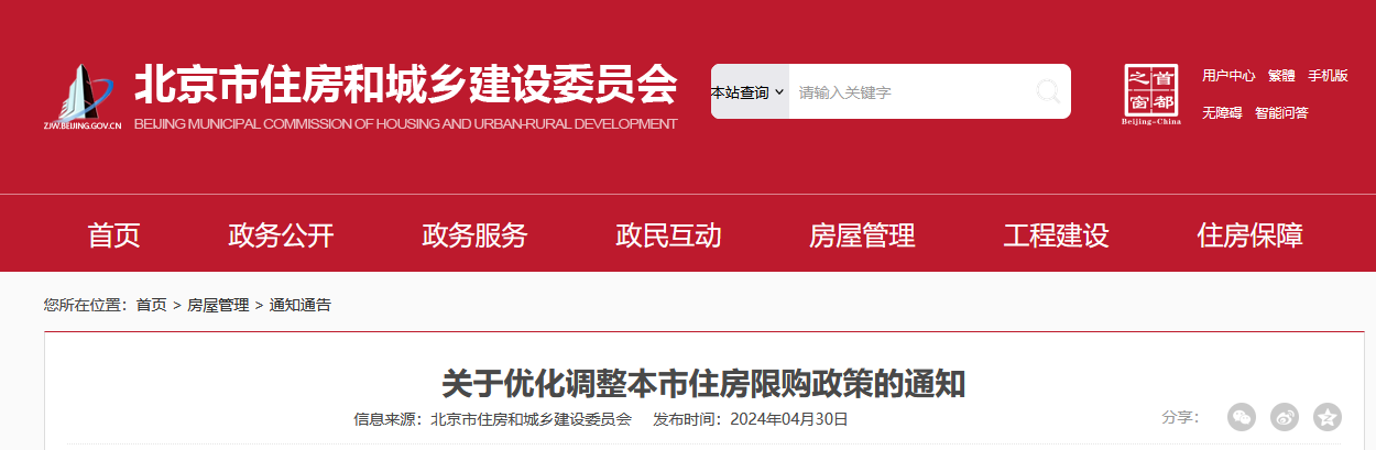 據北京市住房和城鄉建設委員會30日消息,北京市住建委引發《關於優化調整本市住房限購政策的通知》,其中提出,自5月1日起,在京擁有2套住房的北京户籍家庭、在京擁有1套住房的北京户籍單身人事、連續五年在北京繳納社保、個人所得税的非北京户籍人士/家庭可在五環外新購買1套商品住房。