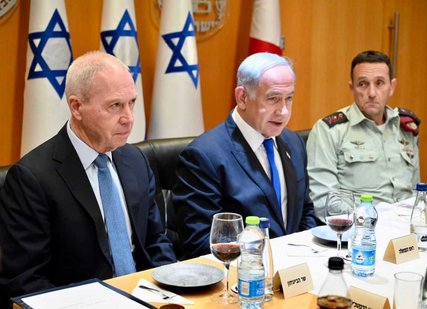 從左至右分別為:以色列防長加蘭特、總理內塔尼亞胡、以軍參謀長哈勒維。圖自《以色列時報》