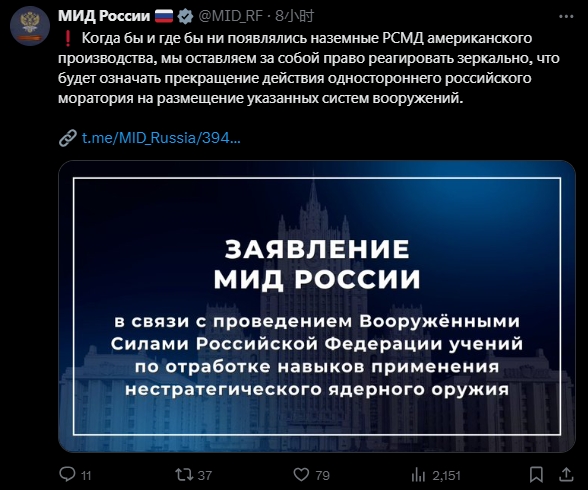 聲明提到,近一段時間,美西方國家持續援烏武器並公開宣佈支持烏克蘭襲擊俄領土的“恐怖主義行為”,包括英法提供的遠程導彈、美國提供的可以打擊俄領土的ATACMS系列導彈,“對俄羅斯國家安全構成額外威脅”。美國還通過在世界各地部署中程陸基導彈系統,增加了對俄羅斯的“多方面導彈威脅”。