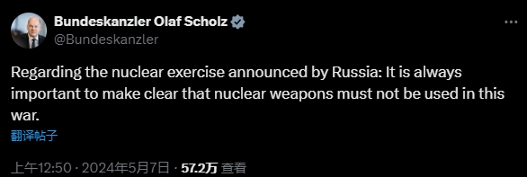 德國總理朔爾茨同日則回應説:“始終要明確一點,在這場戰爭中絕不能使用核武器。”