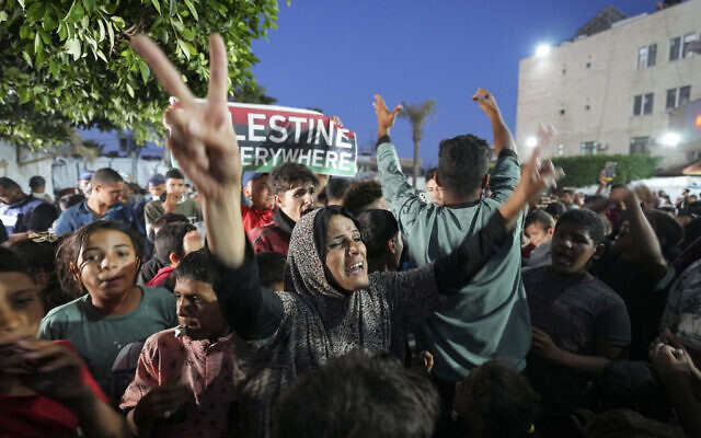 據《以色列時報》報道,在哈馬斯同意停火提議的消息傳出後,加沙地帶巴勒斯坦人在街頭慶祝。