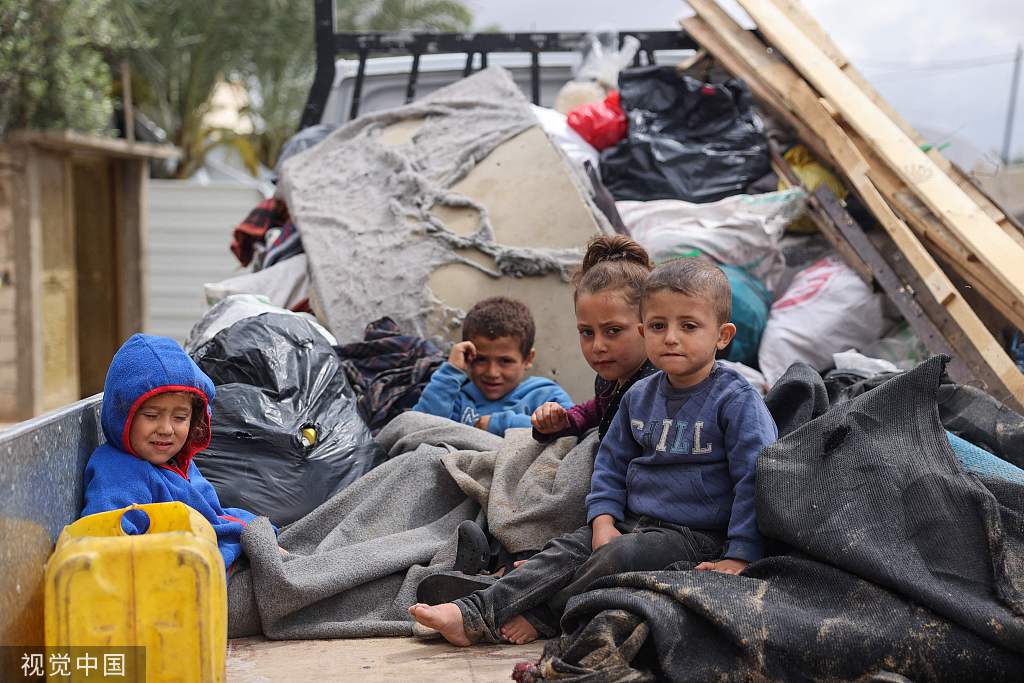 當地時間2024年5月6日,加沙地帶,流離失所的巴勒斯坦人按照以色列軍隊的撤離命令收拾行李。以色列和哈馬斯之間的戰鬥仍在持續。(圖源:視覺中國)