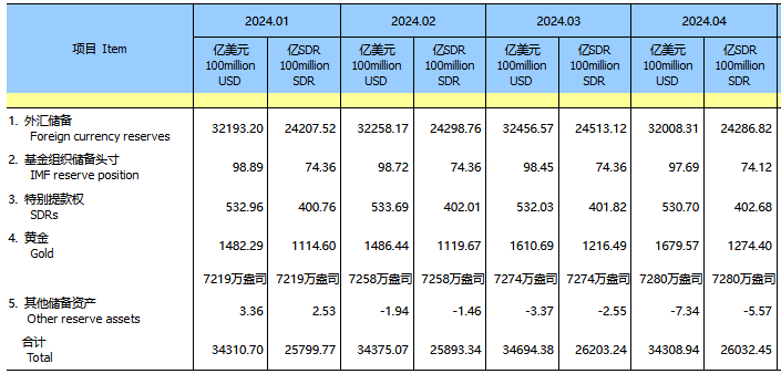 另一方面,截至2024年4月末,我國外匯儲備規模為32008億美元,較3月末下降448億美元,降幅為1.38%。