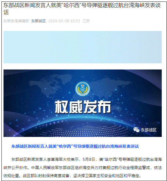 東部戰區新聞發言人李熹海軍大校表示,5月8日,美“哈爾西”號導彈驅逐艦過航台灣海峽並公開炒作。中國人民解放軍東部戰區組織海空兵力對美艦過航行動全程跟監警戒,依法依規處置。戰區部隊時刻保持高度戒備,堅決捍衞國家主權安全和地區和平穩定。