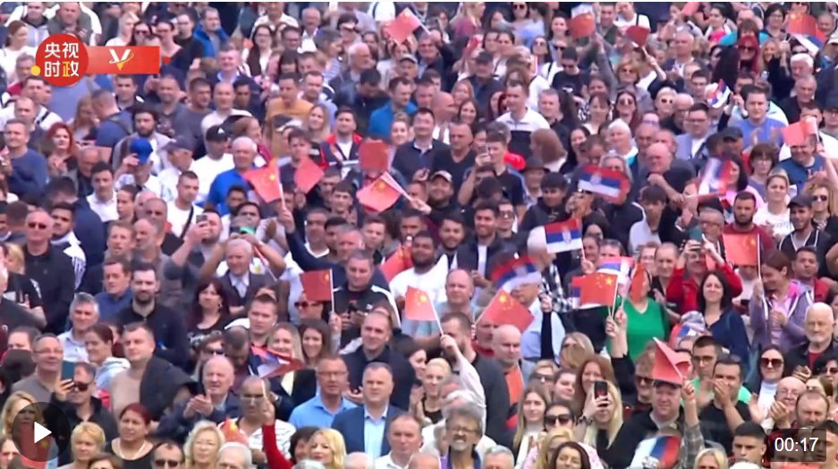 武契奇陪同習近平來到政府大廈平台。大廈廣場上,一萬五千名塞爾維亞民眾揮舞中塞兩國國旗,對習近平表示最熱烈的歡迎。習近平向歡迎人羣揮手示意。廣場上響起雷鳴般的掌聲,歡呼聲此起彼伏,經久不息。