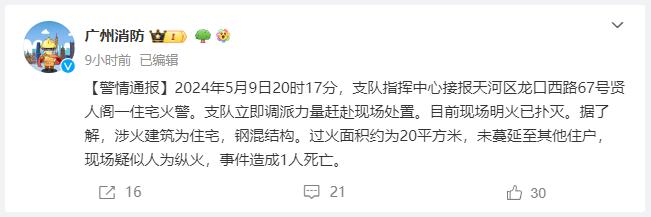 5月9日,廣東省廣州市消防支隊官方微博(@廣州消防)通報稱,9日20時17分,支隊指揮中心接報天河區龍口西路67號賢人閣一住宅火警。支隊立即調派力量趕赴現場處置。目前現場明火已撲滅。