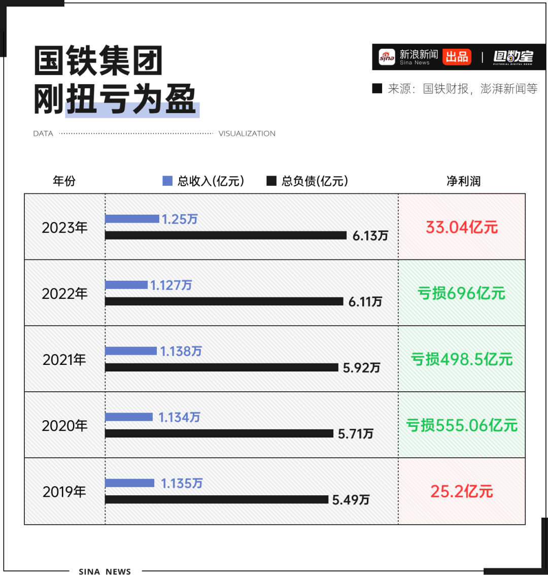與之相對的是2023年國鐵集團總收入完成1.25萬億元,同比增長10.62%。淨利潤由負轉正,且首次突破30億元大關,達到33.04億元。但總負債也達到新高,為6.13萬億元,2005年,這一數字僅為4768億元。