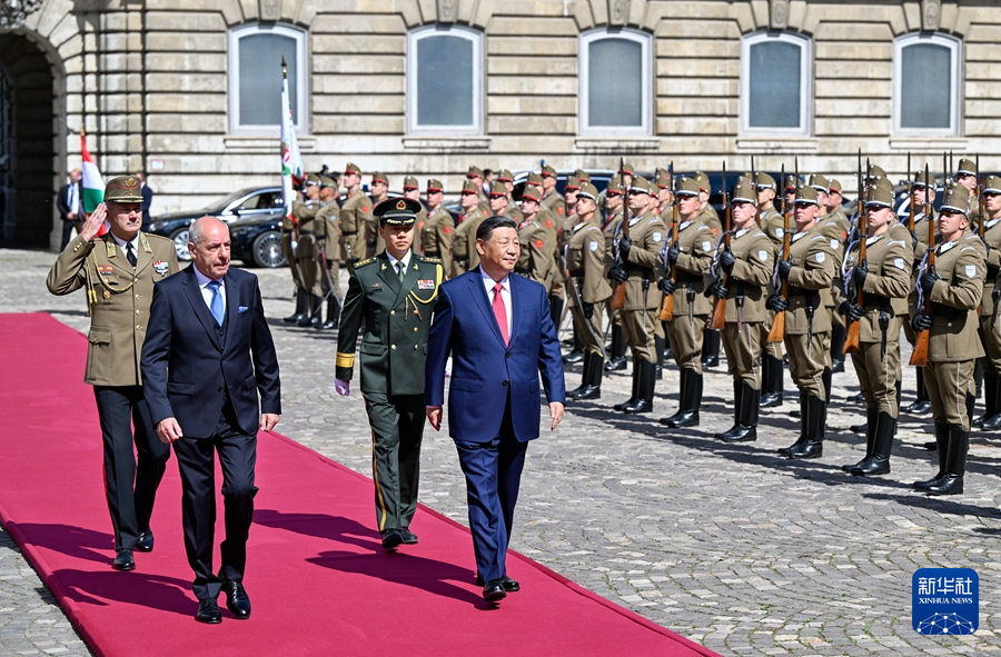 當地時間5月9日上午,國家主席習近平在布達佩斯出席匈牙利總統舒尤克和總理歐爾班共同舉行的隆重歡迎儀式。這是習近平在舒尤克陪同下檢閲儀仗隊。新華社記者 殷博古 攝