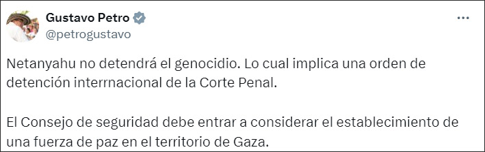 佩特羅在社交媒體上發文,敦促國際刑事法院和安理會採取行動