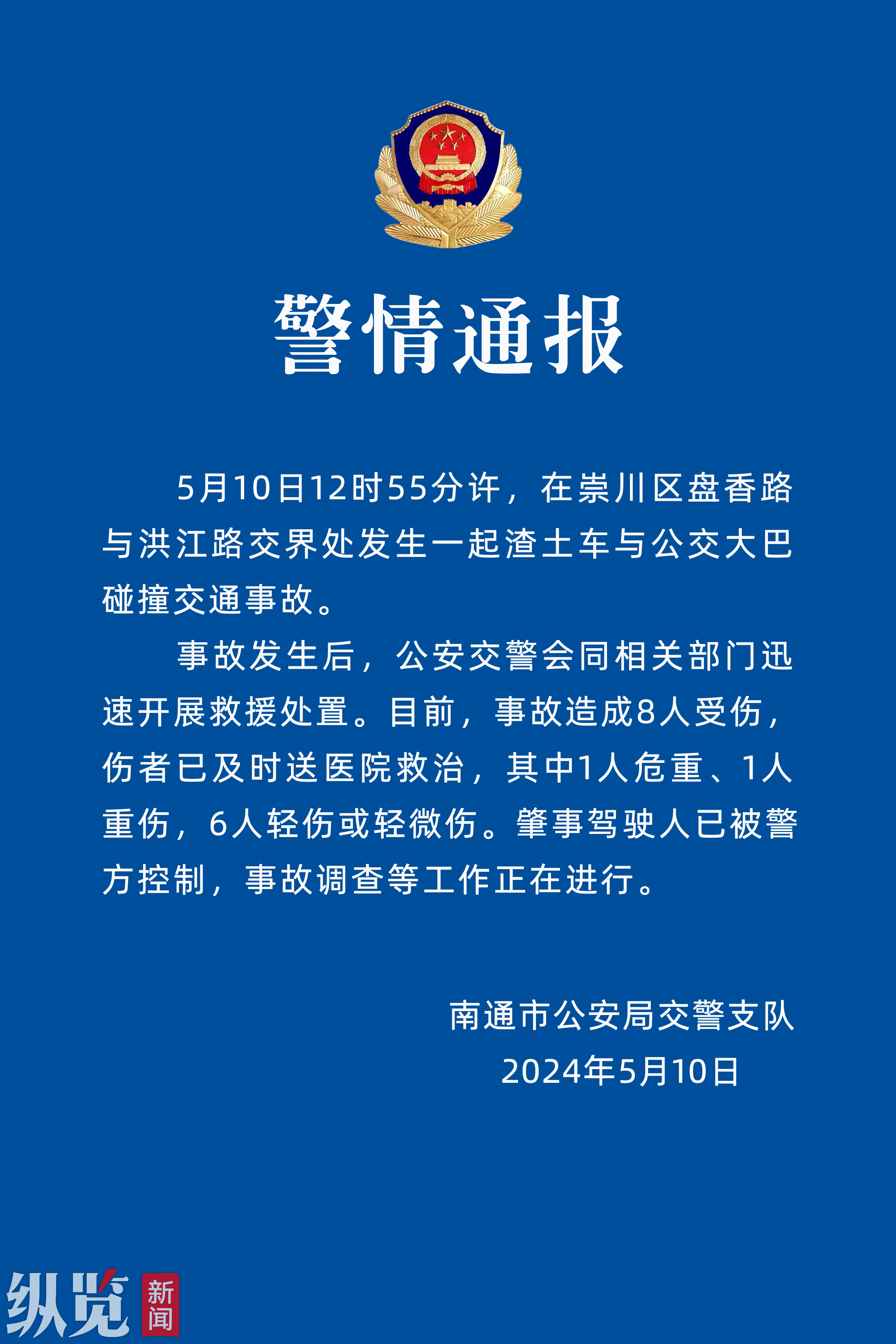10日下午3時50分,“南通交警”微信公眾號發佈警情通報稱,事故造成8人受傷,肇事駕駛人已被警方控制,事故調查等工作正在進行。據央視新聞報道稱,大巴車為學校組織學生活動車輛。