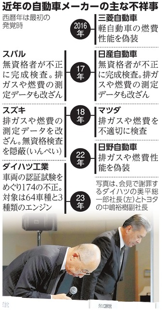 由於汽車一直是日本媒體的最大廣告投入商之一,日媒對汽車企業的醜聞通常諱莫如深。儘管如此,2023年12月30日的《朝日新聞》仍總結了這些年日本汽車企業的主要造假案例: