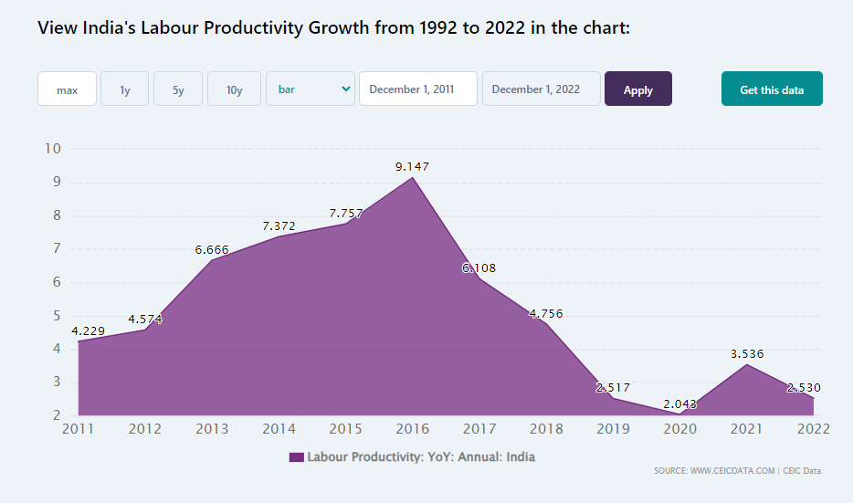 2011年至2022年,印度勞動生產率年增速走勢圖 圖自:斯爾亞司(CEIC)數據信息有限公司數據庫