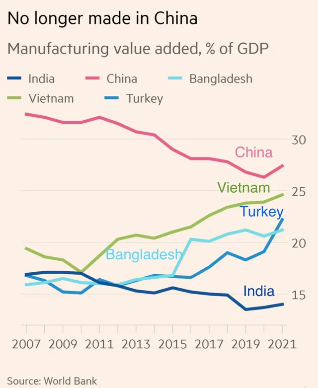 中國(紅)、印度(深藍)的製造業增加值佔GDP比例歷年變化圖 圖自:《金融時報》 數據來源:世界銀行