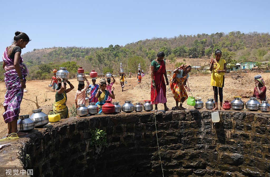 2024年5月1日,印度孟買Vihigaon村的村民們從井裏打水。儘管Vaitarna河離村子只有幾公里遠,但河裏的水被分流到孟買市使用,因此每年夏天村民們都沒有水喝 圖文:視覺中國