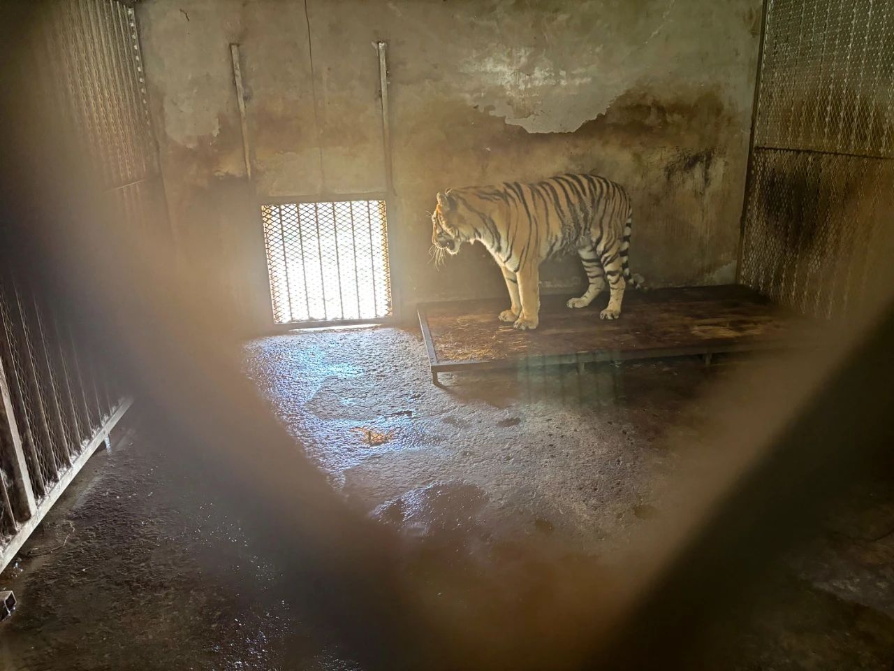 目前,園區內存活着的16只東北虎以及非洲獅、長頸鹿、黑熊等動物,長期被關在運輸鐵籠中,空間狹小,生存狀態堪憂。