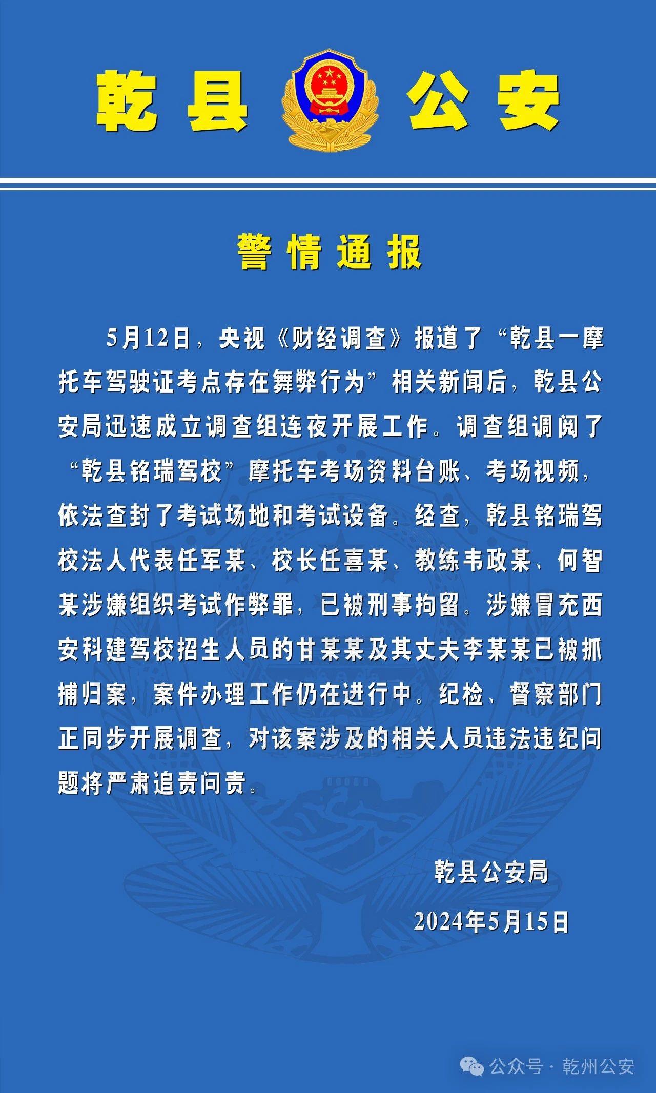 經查,乾縣銘瑞駕校法人代表任軍某、校長任喜某、教練韋政某、何智某涉嫌組織考試作弊罪,已被刑事拘留。涉嫌冒充西安科建駕校招生人員的甘某某及其丈夫李某某已被抓捕歸案,案件辦理工作仍在進行中。紀檢、督察部門正同步開展調查,對該案涉及的相關人員違法違紀問題將嚴肅追責問責。