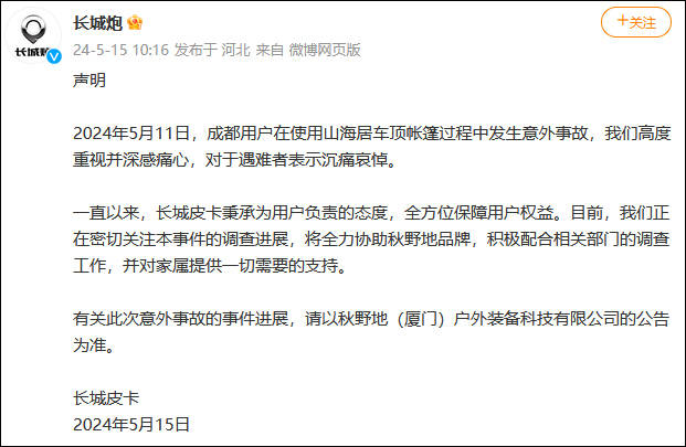 5月15日,@長城炮 發佈聲明稱,5月11日,成都用户在使用山海居車頂帳篷過程中發生意外事故,“我們高度重視並深感痛心,對於遇難者表示沉痛哀悼”。