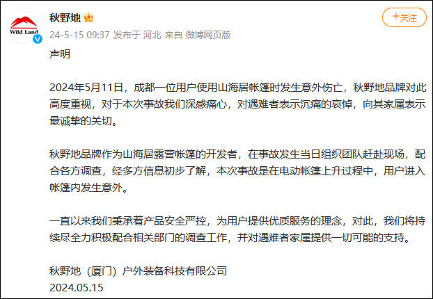 秋野地品牌作為山海居露營帳篷的開發者,在事故發生當日組織團隊趕赴現場,配合各方調查,經多方信息初步瞭解,本次事故是在電動帳篷上升過程中,用户進入帳篷內發生意外。