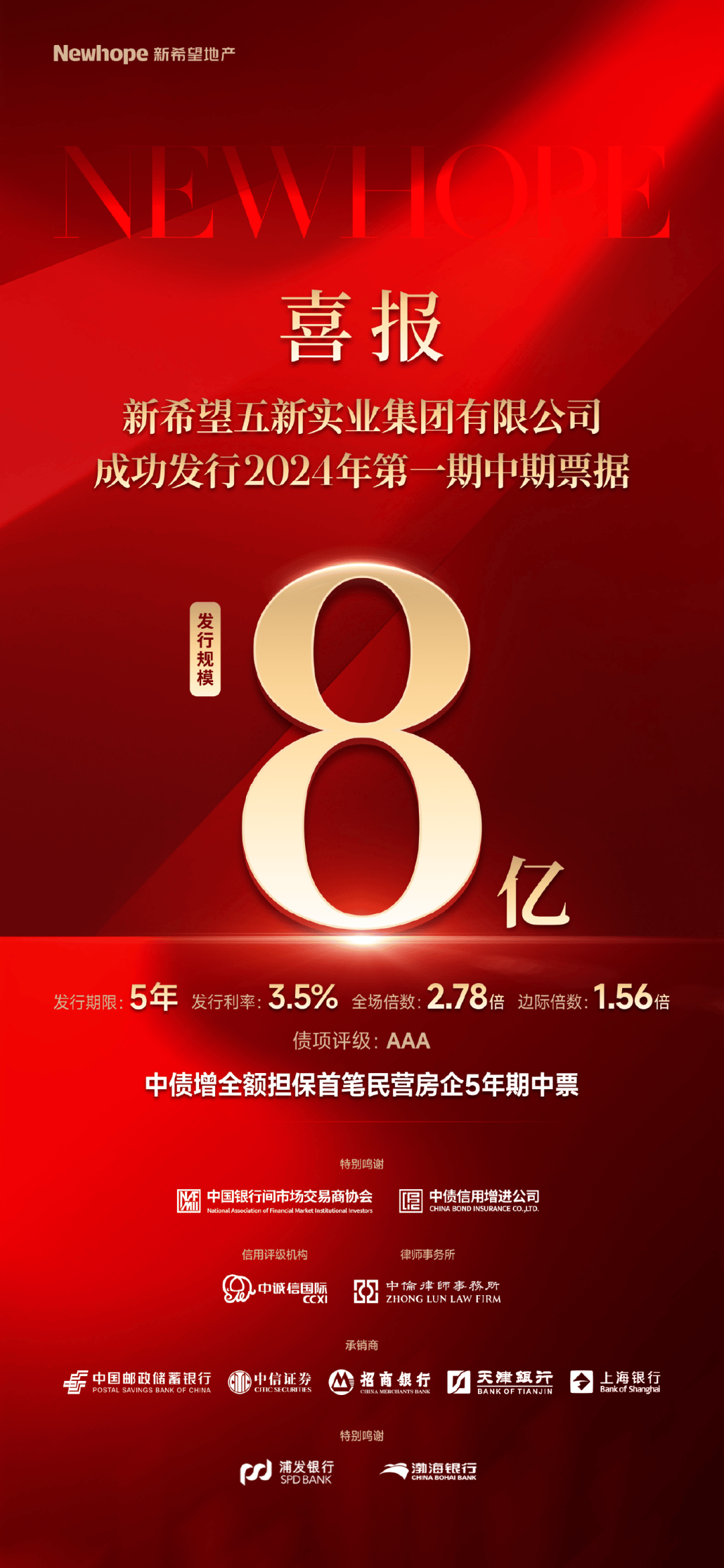 5月14日,新希望五新實業集團有限公司(下稱新希望地產)成功發行2024年度(第一期)中期票據,發行規模8億元,發行期限5年期,發行利率為3.5%,由中債增首次為民營房企提供5年期全額保證擔保。全場認購倍數2.78倍,邊際認購倍數1.56倍。