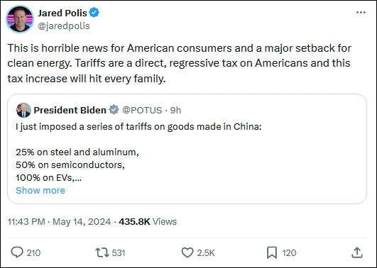 根據白宮消息,美國對中國電動汽車徵收的關税税率將從25%調整為100%,對中國太陽能電池的關税税率將從25%提高到50%。拜登聲稱,這是為了保護美國製造業,但美聯社指出,同為民主黨人的科羅拉多州州長、清潔能源倡導者賈裏德·波利斯(Jared Polis)對此感到並不樂觀。