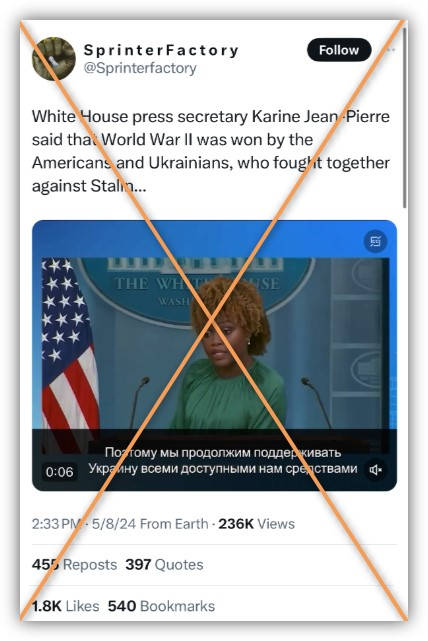 以“利用AIGC製造假新聞”為例,就在最近,在一條快速爆火的短視頻中,白宮發言人讓-皮埃爾在新聞發佈會面對記者提問時,聲稱“二戰是美國和烏克蘭聯合起來打擊希特勒和斯大林的戰爭”。但很快這條視頻就被證實是利用AI技術偽造的:白宮新聞發佈會並未提及這個話題,發言人也從未做過這番論述。據説這條視頻最初開始在互聯網上流傳時配了俄語字幕,因此有人懷疑是俄羅斯製造的假新聞。