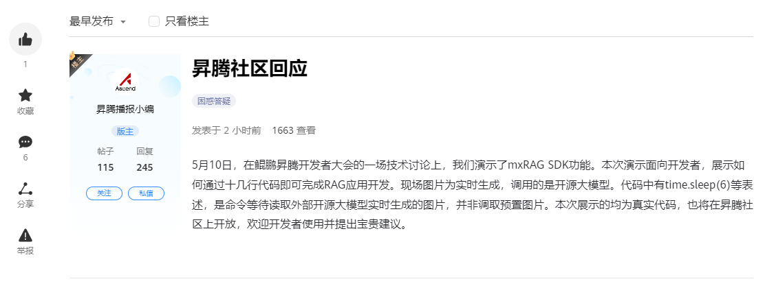 事件起源於5月10日的鯤鵬昇騰開發者大會,當時在一場面向開發者的技術討論會上,華為演示了mxRAG SDK功能,展示如何通過十幾行代碼即可完成RAG應用開發。