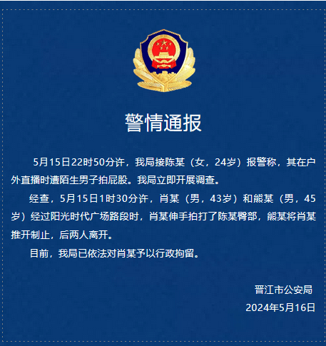 5月15日22時50分許,我局接陳某(女,24歲)報警稱,其在户外直播時遭陌生男子拍屁股。我局立即開展調查。經查,5月15日1時30分許,肖某(男,43歲)和熊某(男,45歲)經過陽光時代廣場路段時,肖某伸手拍打了陳某臀部,熊某將肖某推開制止,後兩人離開。目前,我局已依法對肖某予以行政拘留。