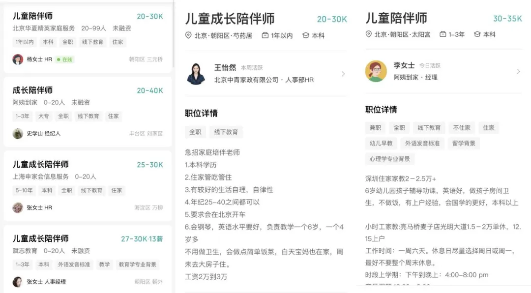 在各大招聘平台上,招聘兒童成長陪伴師的帖子不在少數,需求方中不乏家政公司,包括北京中青家政有限公司、阿姨到家等。