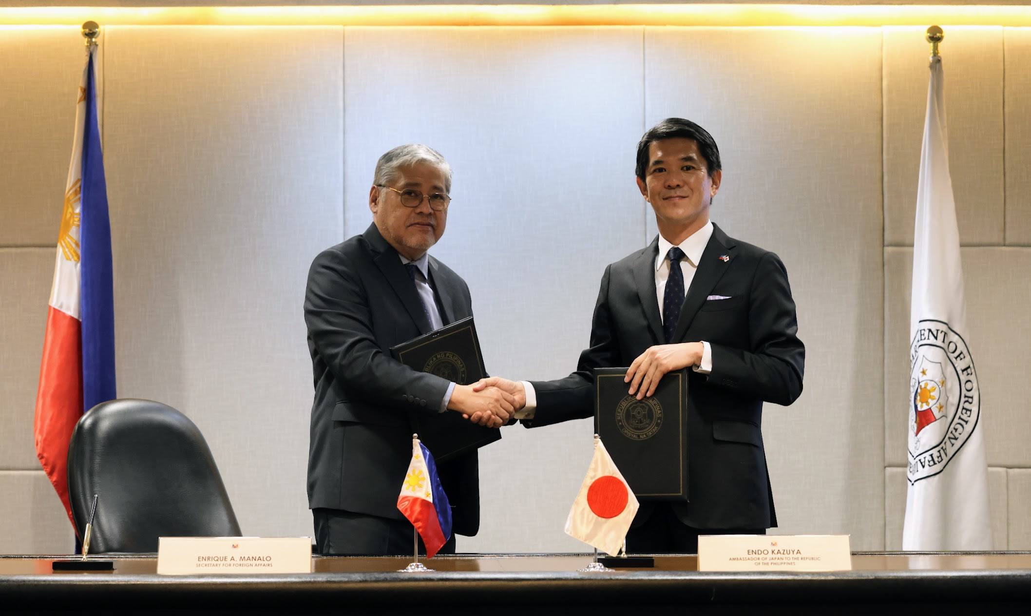 菲律賓外交部長馬納羅(左)與日本駐菲律賓大使遠藤和也(右)簽署了文件。 圖源:菲律賓外交部