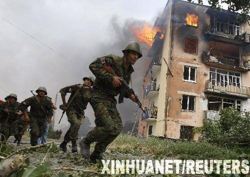 2008年8月9日,格魯吉亞宣佈進入“戰時狀態”;在格魯吉亞南奧塞梯首府茨欣瓦利附近的哥里市,一些格魯吉亞士兵從一座遭襲擊起火的樓房旁邊跑過。圖自新華社/路透