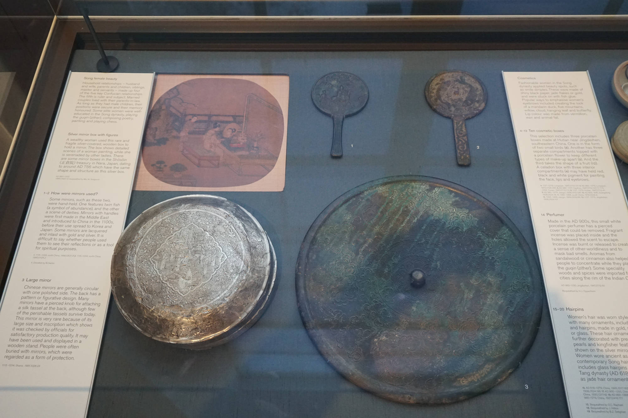 2018年我去大英博物館參觀時,看到這件銀鏡盒的展陳方式已經變了,從“大通鋪”變成了一個相對精緻的“標間”,它的旁邊還陳列着宋代《妝靚仕女圖》的複製品和三面宋代銅鏡,展品介紹文字中也提到正倉院收藏的類似木質鏡盒。這讓我感到非常欣慰,我的研究成果為大英博物館的展陳提供了有力的學術支撐。