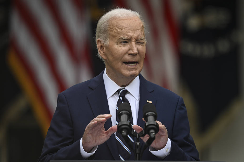 當地時間5月14日,拜登在白宮玫瑰園發表講話,宣佈對中國電動汽車等產品加徵關税 圖源:視覺中國