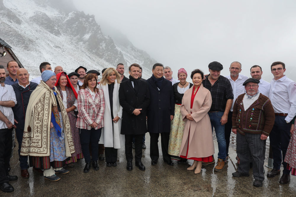 當地時間5月7日,應法國總統馬克龍特別邀請,國家主席習近平乘專機來到法國西南部上比利牛斯省訪問。這是在圖爾馬萊山口,習近平和夫人彭麗媛、馬克龍和夫人布麗吉特同當地村民親切合影。新華社記者 姚大偉 攝