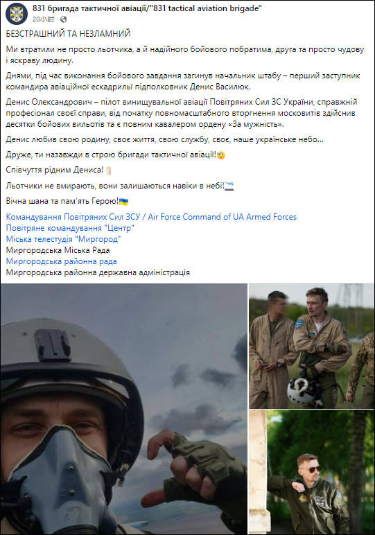 烏克蘭武裝部隊第831戰術航空兵旅宣佈瓦西柳克陣亡