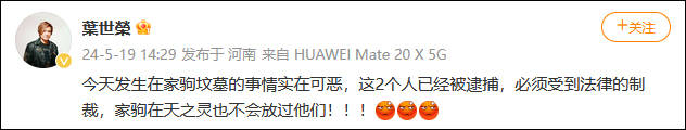 Beyond樂隊鼓手葉世榮在微博發文稱,“今天發生在家駒墳墓的事情實在可惡,這2個人已經被逮捕,必須受到法律的制裁。”