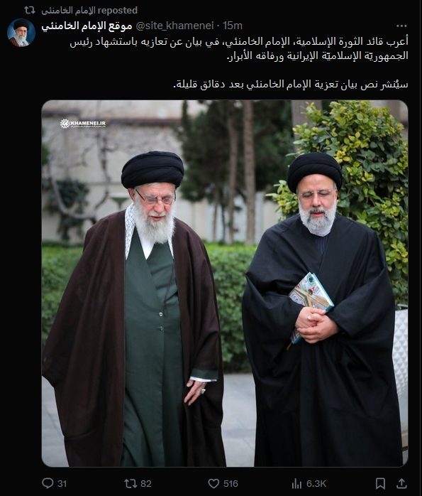 哈梅內伊的社交媒體X(原推特)賬號20日發佈帖文,並配上了一張他和萊希的合照。帖文寫道:“伊斯蘭革命最高領袖伊瑪目哈梅內伊在一份聲明中對伊朗伊斯蘭共和國總統及其光榮戰友的殉難表示哀悼。”