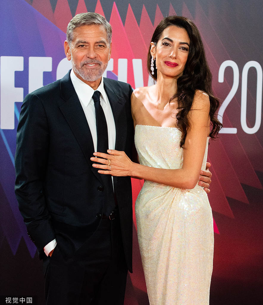 當地時間2021年10月10日,倫敦,阿邁勒·克魯尼及其丈夫喬治·克魯尼出席第65屆倫敦電影節。(圖源:視覺中國)
