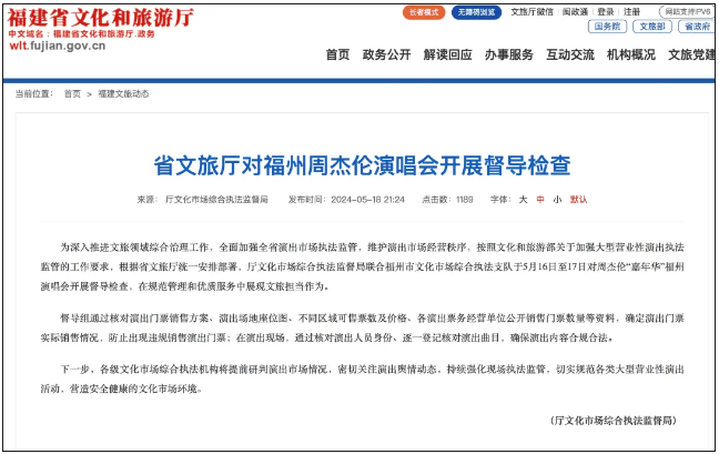 福建省文旅廳:對周杰倫福州演唱會開展督導檢查