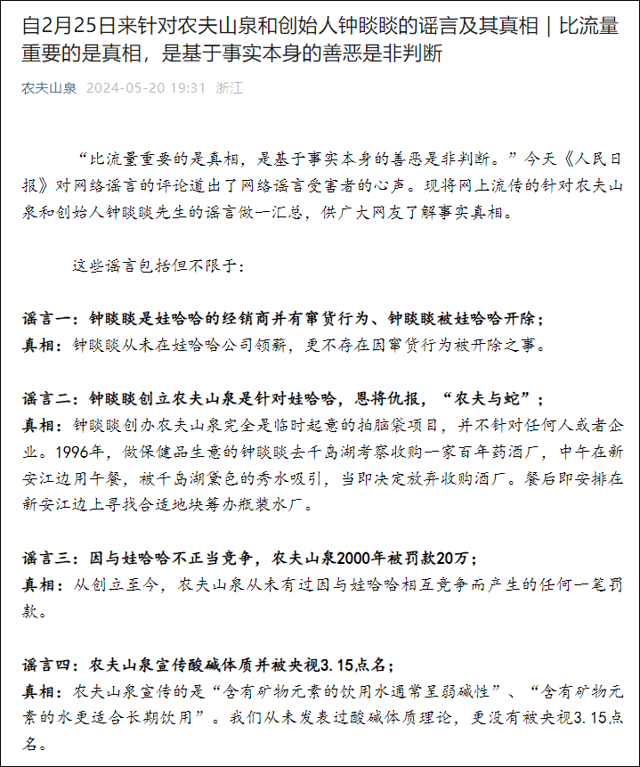 5月20日晚間,農夫山泉在微信公眾號發佈《自2月25日來針對農夫山泉和創始人鍾睒睒的謠言及其真相》,對近期網絡上存在的20條相關輿論進行辯駁和闢謠。